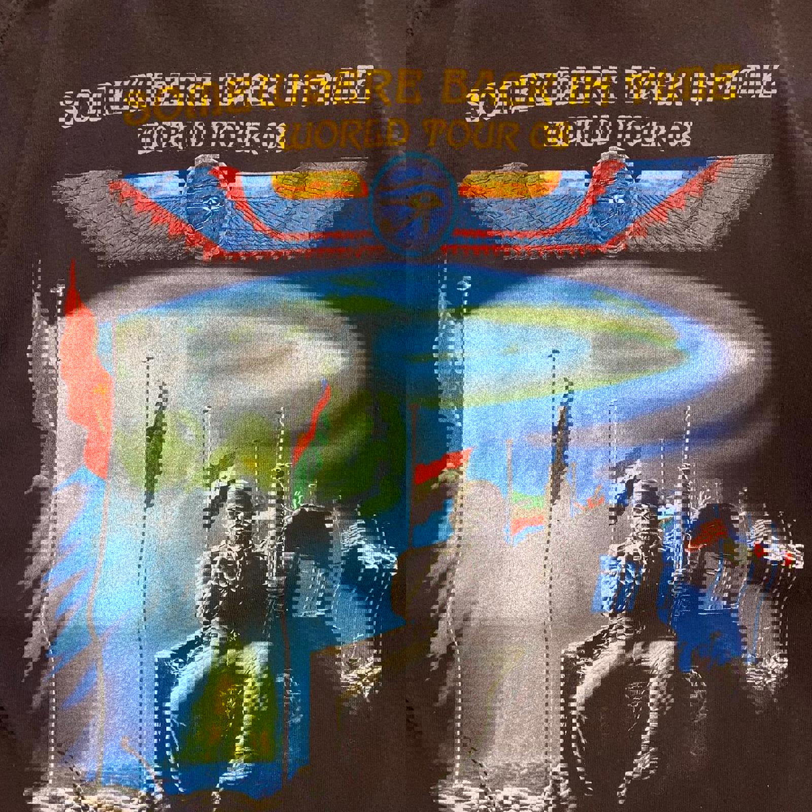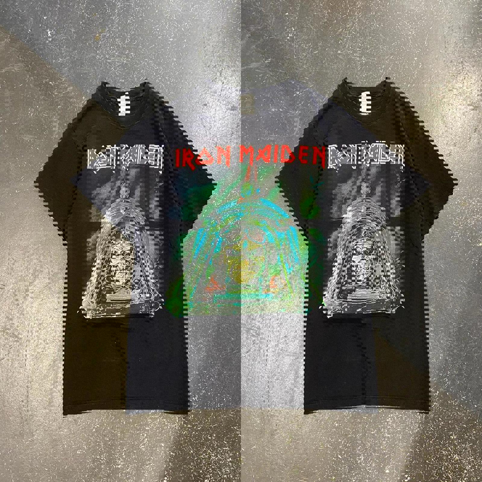 black graphic tee, metal band shirt, vintage concert tee, distressed look, 2000s style, tour memorabilia, heavy metal fashion, band merch, oversized fit, collectible T-shirt